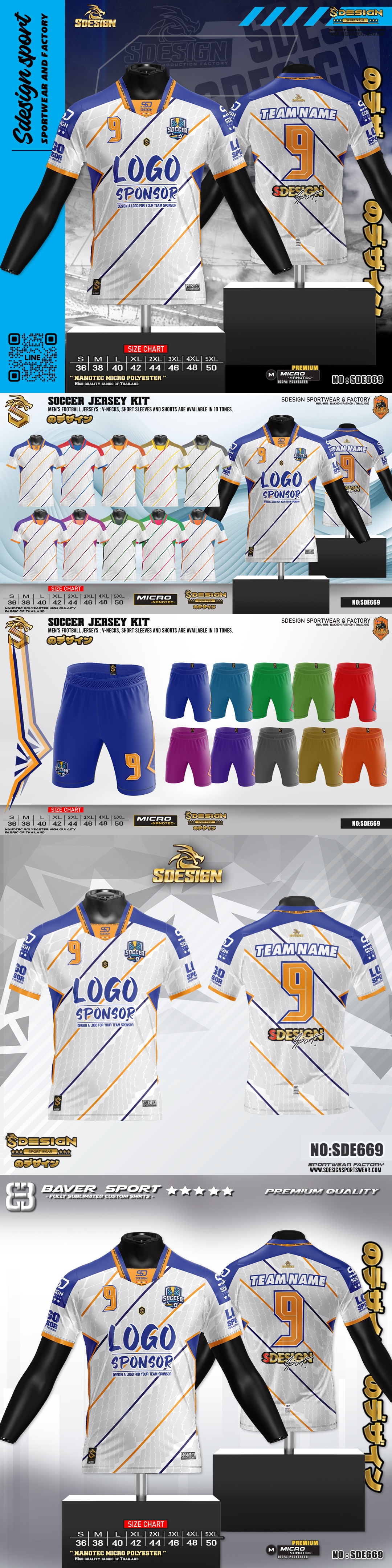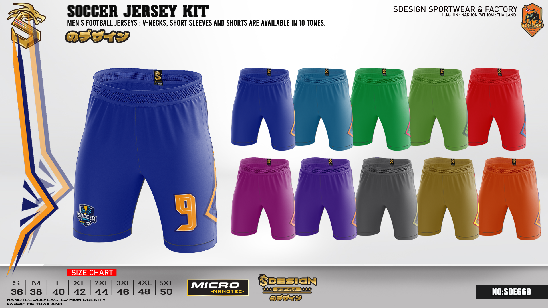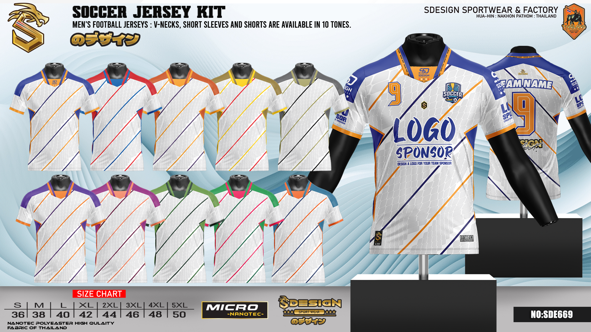 รูปแบบเสื้อผ้า : คอ 5 เหลี่ยม มีลิ้น แขนสั้น และ กางเกงฟุตบอล ขาสั้น งานออกแบบปรับโทนสี ให้ ลูกค้าเลือกได้ทั้งหมด 10 โทนสี