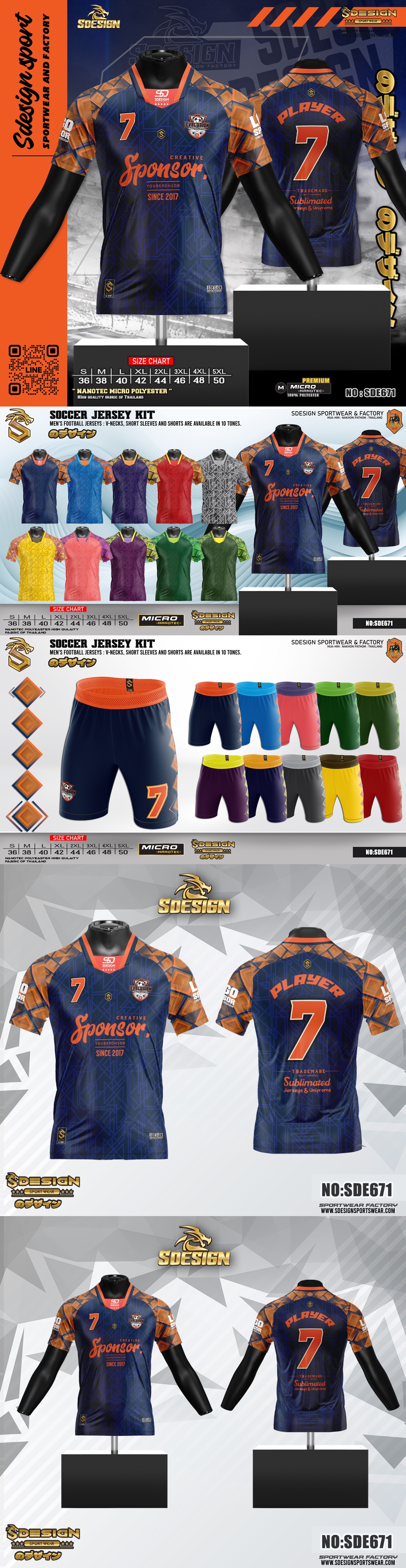 รูปแบบเสื้อผ้า : คอ 5 เหลี่ยม มีลิ้น แขนสั้น และ กางเกงฟุตบอล ขาสั้น งานออกแบบปรับโทนสี ให้ ลูกค้าเลือกได้ทั้งหมด 10 โทนสี