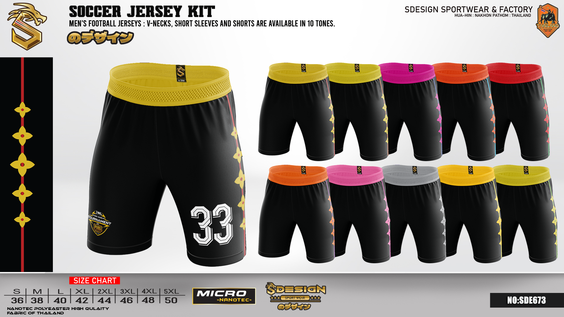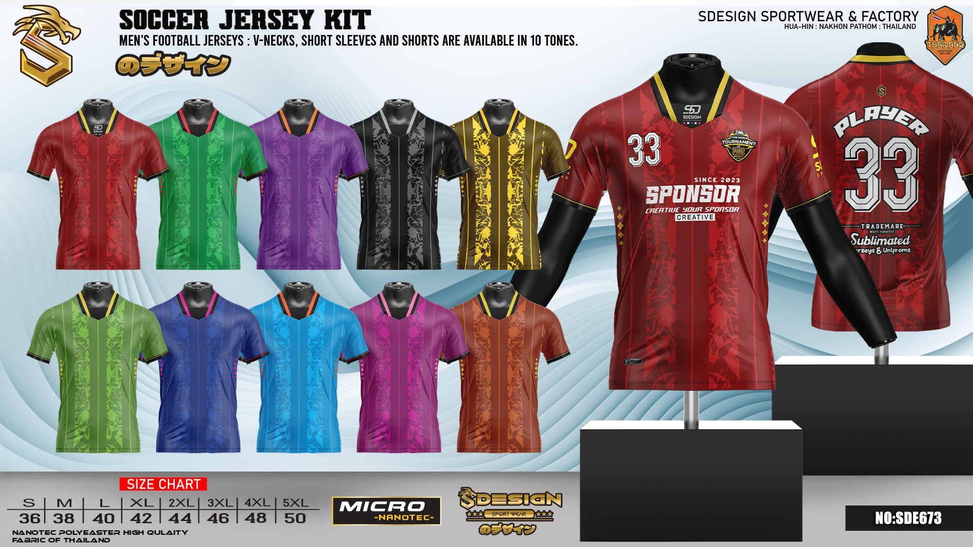 รูปแบบเสื้อผ้า : คอ 5 เหลี่ยม มีลิ้น แขนสั้น และ กางเกงฟุตบอล ขาสั้น งานออกแบบปรับโทนสี ให้ ลูกค้าเลือกได้ทั้งหมด 10 โทนสี